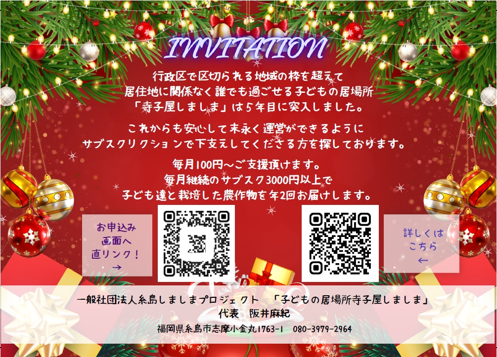 年間を通して子ども達の居場所を応援してくださるサンタさんを100名募集!https://terracoya.net/donate/ 第1弾は、クリスマスデザインで呼び掛けてみようということで、カードを作成しました。が、手渡しが叶わない皆様へは、WEBでのお願いとなり申し訳ありません。 月1000円、1日にすると33円程のお気持ちを向けてくださる方が、100名いら… -